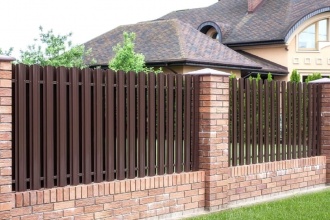 Заборы из металлического штакетника с кирпичными столбами в Шатуре